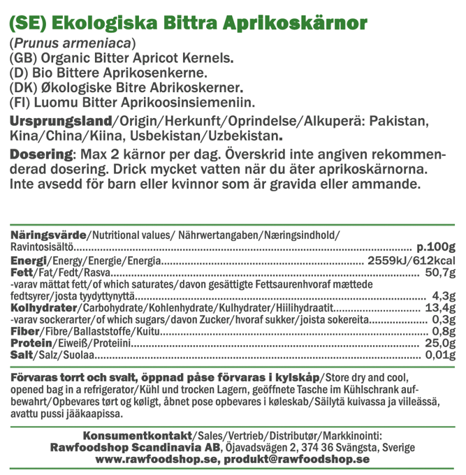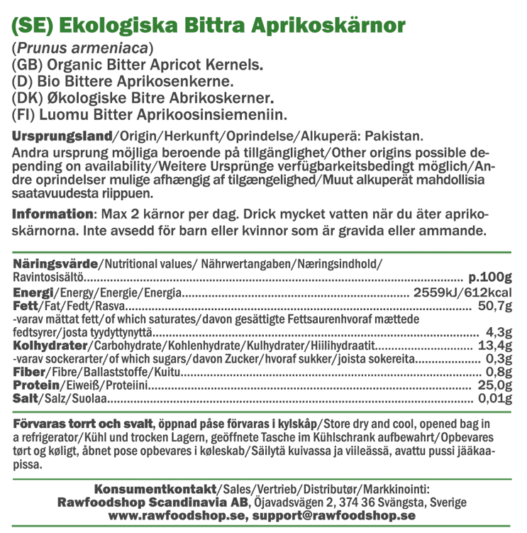 Meidän katkerat aprikoosinsiemenemme ovat sekä luomuviljeltyjä että EU-luomusertifioituja, mikä takaa, että ne on tuotettu kestävällä tavalla. Nämä aprikoosinsiemenet ovat peräisin makeista/happamista aprikooseista ja sisältävät amygdaliinia (laetrilia), joka antaa niille ainutlaatuisen maun, joka muistuttaa karvasmantelia.