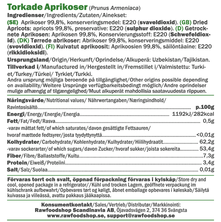 Rawfoodshopin kuivatut aprikoosit ovat kauniin kullanvärisiä ja luonnollisen makeita. Hedelmät saavat kypsyä auringossa ennen kuin ne poimitaan ja kuivataan hellävaraisesti, jotta niiden kirkas väri, mehukas rakenne ja hedelmäinen maku säilyvät. Lopputuloksena on aprikooseja, jotka sopivat niin naposteluun kuin leivontaan ja ruoanlaittoon. Klassikko keittiössä, jossa yhdistyy hyvä maku ja monipuolinen käyttö.