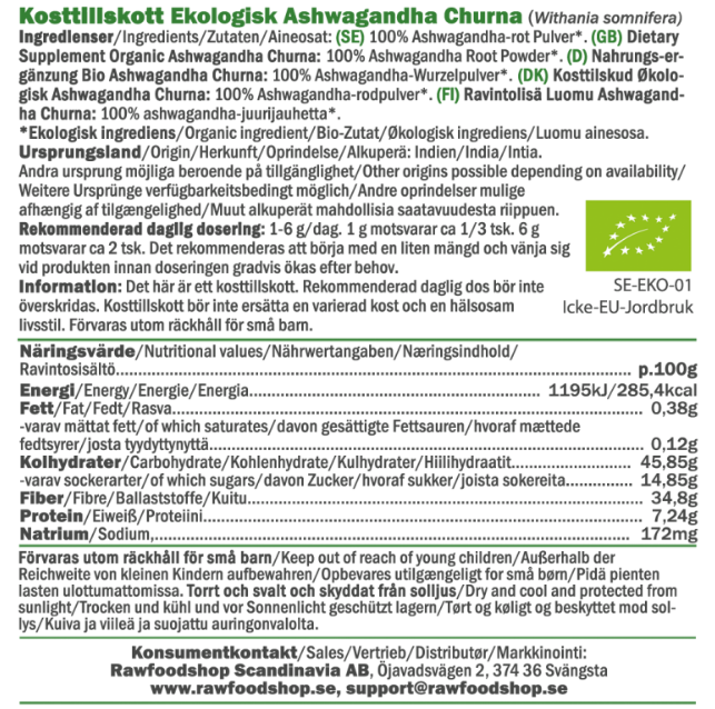 Ashwagandha Churna LUOMU on luomulaatuinen ravintolisä, joka koostuu 100 % hienoksi jauhetusta ashwagandha-juuresta (Withania somnifera). Tätä kasvia, jota kutsutaan myös "Intian ginsengiksi", pidetään pensasmaisena ja se voi kasvaa jopa 1,5 metrin korkuiseksi. Se tunnistetaan suurista juuristaan, vihreistä soikeista lehdistään ja pienistä oranssinpunaisista marjoistaan.