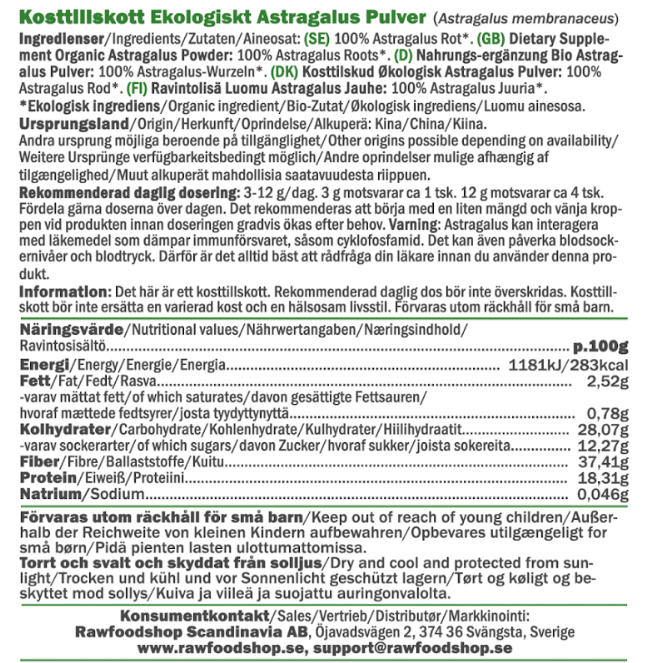 Astragalus-jauhe LUOMU on 100% kuivatuista ja hienoksi jauhetuista Astragalus membranaceus -juurista valmistettu ravintolisä. Saat täysin luonnollisen ja vegaanisen tuotteen ilman turhia lisäaineita – vain puhdasta luomulaatuista astragalusta jauhemuodossa. Sen aito ja laadukas alkuperä tekee siitä täydellisen valinnan sinulle, joka arvostat vastuullisia ja korkealaatuisia tuotteita arjessasi. Jauheessa on mieto, maanläheinen maku, joka sopii erinomaisesti niin ruoanlaittoon kuin juomiinkin. Lisää smoothieihin, sekoita kasvipohjaisen jogurtin joukkoon tai käytä raakapalleroiden ainesosana.