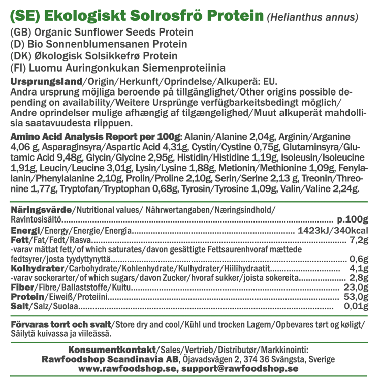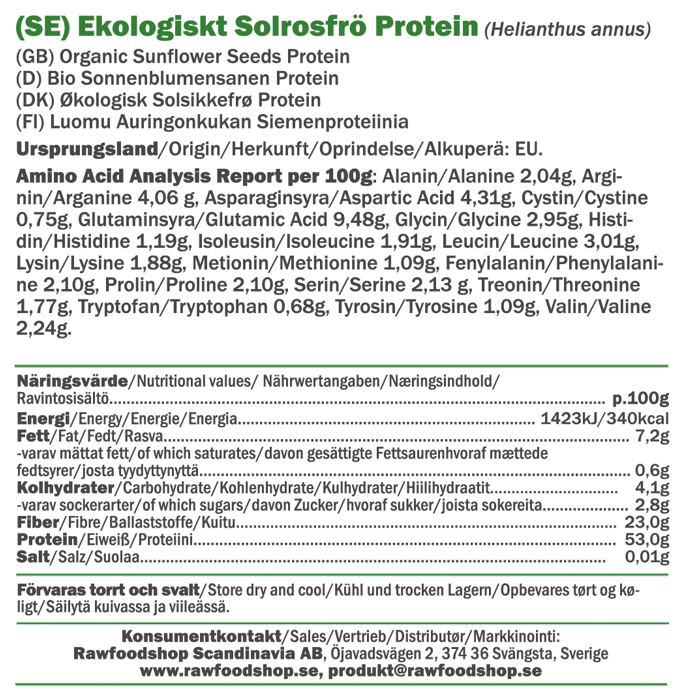 Auringonkukansiemen Proteiini LUOMU on luonnonmukainen ja vegaaninen proteiinijauhe, joka tarjoaa sinulle luonnollisen tavan täydentää ruokavaliotasi. Huolella valituista auringonkukansiemenistä valmistettu proteiinijauhe on erinomainen valinta sinulle, joka haluat monikäyttöisen raaka-aineen ruoanlaittoon. Miedon makunsa ja hienojakoisen koostumuksensa ansiosta auringonkukkaproteiini sopii moniin käyttötarkoituksiin. Voit helposti lisätä sitä esimerkiksi mehuihin, keittoihin, smoothieihin ja energiapatukoihin.
