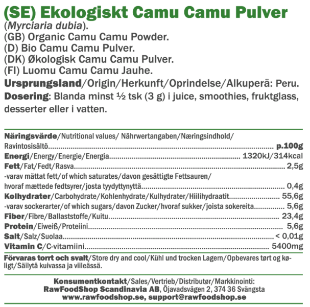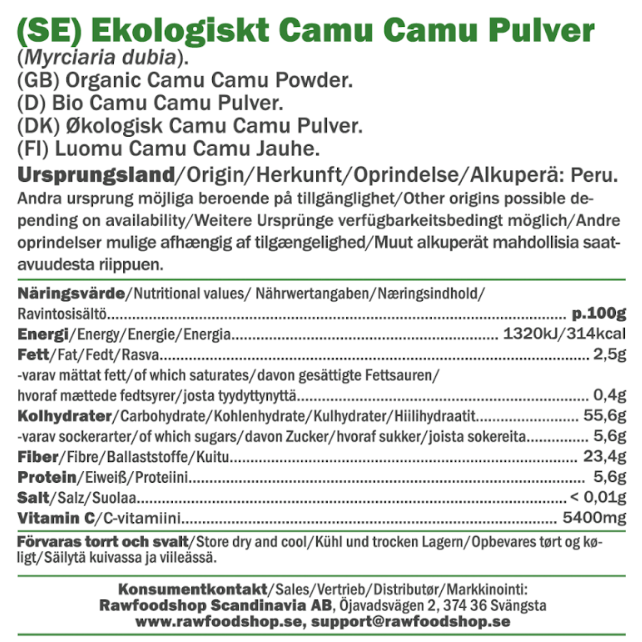 Camu camu-hedelmällä on pitkä perinne Amazonin alueella, jossa se on ollut osa paikallisväestön ruokavaliota pitkään. Pienet, pyöreät hedelmät ovat tunnettuja kypsyessään saadusta punertavasta väristään, mikä tekee niistä helposti tunnistettavia. Camu camu-jauheemme on luomusertifioitu, mikä tarkoittaa, että sitä viljellään ilman kemiallisten torjunta-aineiden tai keinotekoisten lannoitteiden käyttöä. Luomutuotteet tukevat biologista monimuotoisuutta ja edistävät kestäviä viljelymenetelmiä. Jauhe on myös raakaruokaa, mikä tarkoittaa, että se kuivataan hellävaraisesti matalissa lämpötiloissa hedelmän luonnollisen maun ja laadun säilyttämiseksi. Tämä raaka kuivatusprosessi on ratkaiseva hedelmän alkuperäisen luonteen säilyttämiseksi, mikä varmistaa, että saat tuotteen, joka on mahdollisimman lähellä luonnon ruokakomeroa.