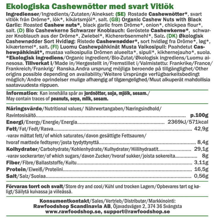 Nämä cashewpähkinät eivät ole mitä tahansa naposteltavaa – ne tarjoavat täysin omanlaisensa makuelämyksen. Ne on kuivapaahdettu ilman lisättyä rasvaa ja maustettu mustalla valkosipulilla, joka on peräisin Ranskan La Drômesta. Musta valkosipuli valmistetaan perinteisellä japanilaisella menetelmällä, joka antaa sille syvän tumman värin ja pehmeän, makeanhappaman maun, jossa voi aistia balsamiviinietikan vivahteita. Tuloksena on hienostunut ja moniulotteinen mausteisuus, joka täydentää cashewpähkinän luonnollista makeutta täydellisesti.