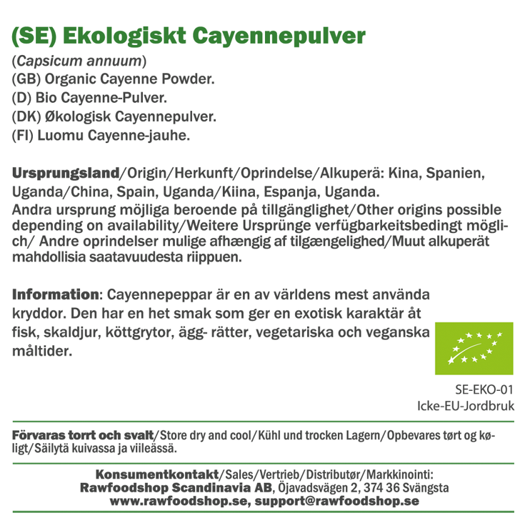 Cayennepippuri on maustehyllyn klassikko, ja meidän luomuversiomme ei ole poikkeus. Tämä voimakkaan tulinen ja syvän aromikas cayenne antaa makua kaikkeen pataruoista ja keitoista kastikkeisiin ja marinadeihin. Hienoksi jauhettu koostumus tekee siitä helppokäyttöisen – saat juuri sopivan määrän potkua ilman että maku käy liian voimakkaaksi. Valitsemalla luomulaatuisen tuotteen tuet sekä ympäristöä että laadukasta viljelyä. Cayenne valmistetaan kuivatuista chilipaprikoista, jotka jauhetaan hienoksi jauheeksi – puhdasta, yksinkertaista ja täynnä makua.