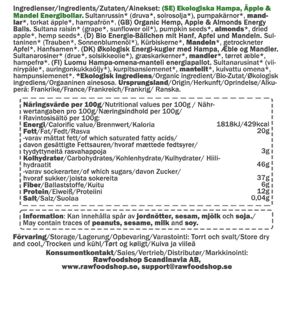 Hamppu Omena Manteli Energiapallot LUOMU ovat täydellinen valinta, kun kaipaat jotain hyvää ja fiksua energiatasojen kohottamiseen. Nämä rawfood-energiapallot on valmistettu huolella valituista luomuraaka-aineista, jotka yhdessä tarjoavat tasapainoisen ja herkullisen makuelämyksen. Makeat sultaniinirypäleet, rapeat kurpitsansiemenet, pehmeä manteli, kuivattu omena ja ravinteikkaat hampunsiemenet tuovat jokaiseen suupalaan miellyttävää rakennetta ja luonnollista makeutta. Pieni pussi kulkee helposti mukana – olitpa sitten matkalla töihin, salille tai kaipaat nopeaa taukoa kiireisen päivän keskellä.