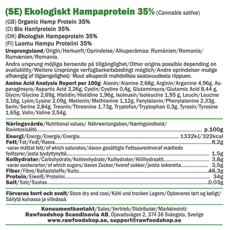 Hamppuproteiini 35% LUOMU on luonnollinen ja kasvipohjainen proteiinijauhe, joka on valmistettu luomuhamppunsiemenistä. Sen mieto, pähkinäinen maku tekee siitä erinomaisen lisän tasapainoiseen ruokavalioon. Hienojakoisen koostumuksensa ansiosta se sekoittuu helposti smoothieihin, puuroihin, leivonnaisiin ja muihin ruokiin. Täydellinen sinulle, joka haluat vaihdella proteiinijauheiden käyttöä ja löytää uusia tapoja lisätä kasvipohjaista proteiinia arkeesi.