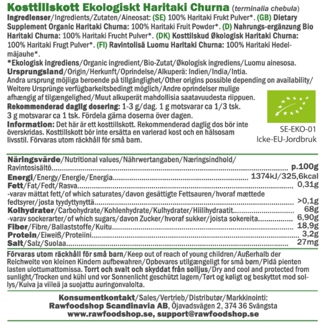 Haritaki Churna on luomu ja vegaaninen ravintolisä, joka on valmistettu Haritaki-hedelmästä (Terminalia chebula). Haritakia käytetään ayurvedassa. Tämä ravintolisä koostuu hienoksi jauhetusta Haritaki-puun pienestä, pähkinämäisestä hedelmästä, joka on ensin kuivattu hellävaraisesti ja sitten jauhettu helposti käytettävään muotoon. Tuote on valmistettu luomulaatuisesti ja raaka-aineita sekä ympäristöä kunnioittaen.