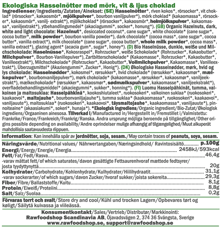 Kolme erilaista suklaakuorrutetta tuovat jokaiseen pähkinään omanlaisensa luonteen: tumma suklaa tuo intensiivistä syvyyttä, valkosuklaa hellii lempeällä makeudellaan ja maitosuklaa tasapainottaa kokonaisuuden pehmeästi. Lopputulos on herkku, jossa moderni herkuttelu kohtaa klassisen laadun – ajaton yhdistelmä, joka toimii aina. Hasselpähkinät Tumma, Valkoinen ja Maitosuklaa LUOMU on täydellinen valinta sinulle, joka arvostat korkeaa laatua ja huolella mietittyjä makuja. Täydellinen herkku kaikille, jotka rakastavat paahdettuja hasselpähkinöitä ja luomusuklaata – täydellisessä harmoniassa.