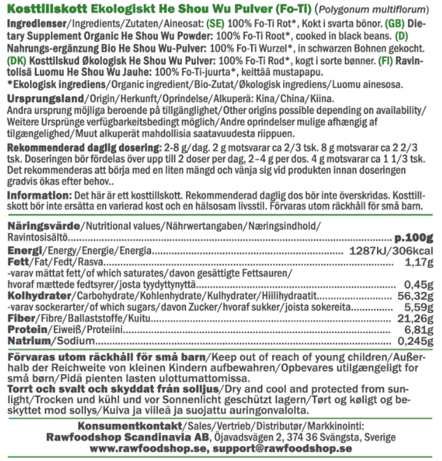 He Shou Wu on luomu ja vegaaninen ravintolisä, joka on valmistettu perinteiseen tapaan käsitellystä He Shou Wu -kasvin juuresta, tunnetaan myös nimellä Fo-Ti. Juuret on kypsennetty mustien papujen kanssa, mikä on osa perinteistä valmistusmenetelmää. Jauhe valmistetaan hellävaraisesti, ja se ei sisällä lisäaineita tai täyteaineita – vain puhdas, laadukas raaka-aine.