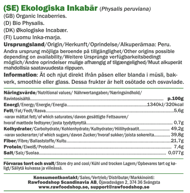 Inkamarjat - rakkaalla lapsella on monta nimeä: ananaskirsikka, kapinmarja ja physalis. Nämä vegaaniset, raakakuivatut marjat ovat pieniä ja makean kirpeitä, ja niiden erottuva maku muistuttaa passionhedelmää. Ne kasvavat ympäri vuoden metrin korkuisissa puissa, joissa on kauniit kermanväriset kukat ja jotka ovat paperimaisessa kuoressa. Inkamarjat ovat hieman rusinoita suurempia ja niiden väri on kauniin kullanvärinen. Ne ovat herkullisia sellaisenaan, mutta niillä on myös monia eri käyttötarkoituksia sekä ruoanlaitossa että leivonnassa.
