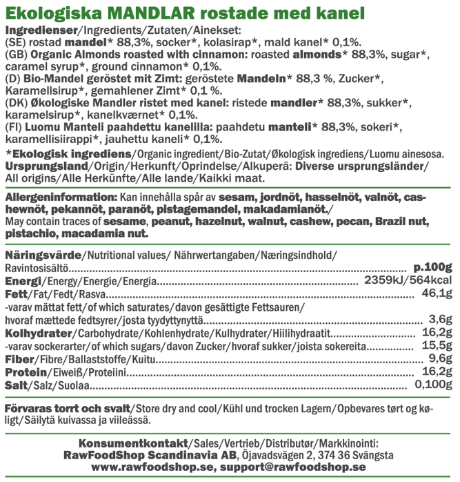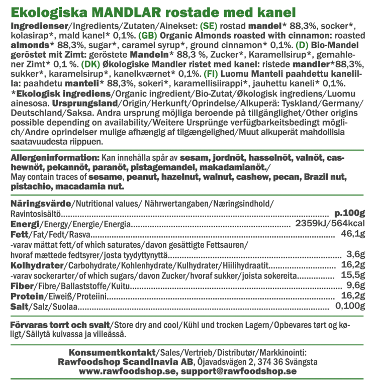 Luomumantelit valitaan tarkoin korkeimman laadun ja parhaan maun takaamiseksi. Jokainen manteli paahdetaan huolellisesti sen luonnollisen rapeuden tuomiseksi esiin, ja lisätty kaneli tuo pehmeää makeutta ja mausteisen vivahteen. Tämä on naposteltava, joka tuntuu ylelliseltä ja luonnolliselta – täydellinen valinta, kun etsit maukasta ja luomua vaihtoehtoa arkeen.