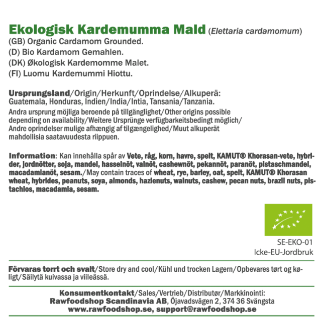 Luomu jauhettu kardemumma on lämmin ja aromaattinen mauste, jota käytetään ympäri maailmaa ruoanlaitossa ja leivonnassa. Hienojauhettu koostumus tekee siitä helppokäyttöisen kaikenlaisiin leivonnaisiin ja juomiin. Alun perin Kaakkois-Aasiasta lähtöisin oleva kardemumma on yksi maailman arvostetuimmista mausteista ja olennainen osa monia perinteisiä reseptejä.