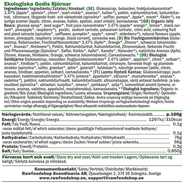 Kuka sanoi, että lauantaiherkut kuuluvat vain lapsille? Meidän luomukarkkikarhumme tuovat väriä perjantai-illan rentoutumishetkeen ja kulkevat kätevästi mukana laukussa pientä makeannälkää varten. Maut kuten omena, appelsiini, sitruuna, mustaherukka, vadelma ja ananas tekevät jokaisesta suupalasta pienen makumatkan. Tämä on vegaaninen karkki ilman liivatetta – täydellinen valinta sinulle, joka haluat nauttia klassisesta hedelmäisestä hyytelökarkista vegaaniseen tai kasvisruokavalioon sopivalla tavalla. Karkkikarhujen pehmeä rakenne ja intensiivinen hedelmäisyys tekevät niistä suosikin niin lapsille kuin aikuisillekin.