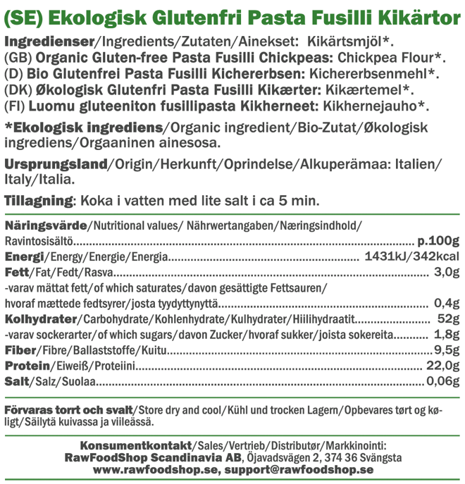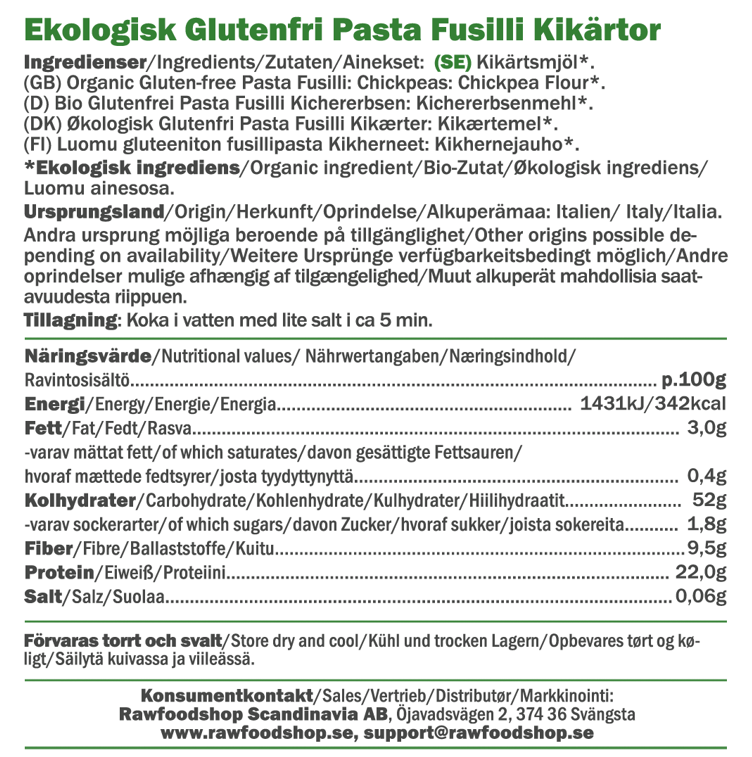 Pasta Fusilli Kikherne LUOMU on fiksu valinta sinulle, joka haluat kokata maukkaita ja luonnollisia aterioita ilman gluteenia. Tässä luomupastassa on vain yksi ainesosa – luomukikhernejauho. Ei turhia lisäaineita, vain puhdasta ja ravinteikasta pastaa. Fusillin kierremuoto nappaa kastikkeet täydellisesti ja sopii mainiosti sekä lämpimiin että kylmiin ruokiin. Kiinteä rakenne ja luonnollinen maku tekevät tästä pastasta erinomaisen korvaajan perinteiselle vehnäpastalle. Ihanteellinen sinulle, joka etsit uusia ideoita vegaanisiin resepteihin tai haluat kokeilla erilaista kikhernepastaa.