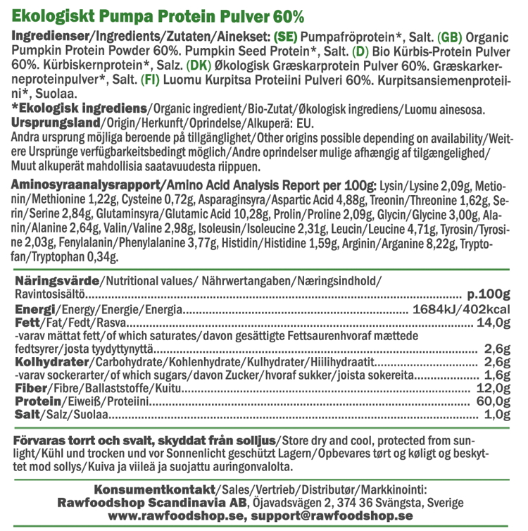 Kurpitsaproteiini 60% LUOMU on kasvipohjainen proteiinijauhe, joka on valmistettu hellävaraisesti käsitellyistä kurpitsansiemenistä. Se on erinomainen vaihtoehto sinulle, joka haluat luonnollisen ja luomulaatuisen vegaanisen proteiinijauheen ilman lisäaineita. Sen pähkinäinen, mieto maku sopii täydellisesti moniin eri ruokiin ja leivonnaisiin. Lisää sitä aamusmoothieesi, käytä kotitekoisessa leivässä tai sekoita suosikkiresepteihisi antaaksesi niille lisäproteiinia kurpitsansiemenistä. Koska jauhe on luomua, sen kaikki luonnolliset ominaisuudet säilyvät, mikä tekee siitä loistavan lisän tasapainoiseen arkeen.