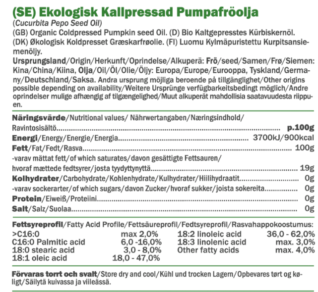 Kylmäpuristettu kurpitsansiemenöljymme on luonnollinen, luomulaatuinen kasviöljy, jonka syvä vihreä väri ja täyteläinen, pähkinäinen maku tekevät vaikutuksen. Kylmäpuristuksen ansiosta kurpitsansiemenen ainutlaatuinen aromi säilyy parhaalla mahdollisella tavalla. Kurpitsansiemenöljy ei kestä kuumennusta, joten se sopii parhaiten kylmiin ruokiin – loistava lisä salaatteihin, marinadeihin tai vaikka keiton päälle viimeistelemään annoksen maku ja ulkonäkö. Myös leivonnassa se tuo mukaan mielenkiintoisen makuvivahteen. Helppo tapa nostaa kotikokkailu uudelle tasolle – luonnollisesti ja ekologisesti. Parhaan säilyvyyden takaamiseksi suosittelemme säilyttämään öljyn jääkaapissa tai viileässä, valolta suojatussa paikassa. Tumma lasipullo auttaa suojaamaan öljyä valolta ja pidentää sen säilyvyyttä.
