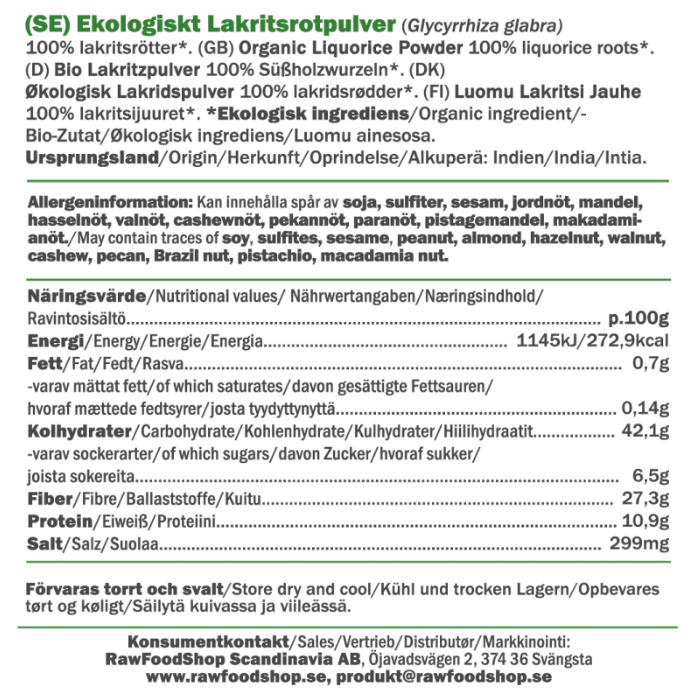 Tutustu upeaan lakritsijuurijauheeseen – ekologiseen ja luonnolliseen maustajaan, joka nostaa leivonnaisesi ja ruokasi uudelle tasolle! Lakritsijuuri tunnetaan ainutlaatuisesta, makeahkosta maustaan, jossa on aniksen vivahteita, jotka tuovat esiin sekä makeiden että suolaisten luomusten parhaat puolet. Hienoksi jauhettu lakritsijuurijauheemme on helppokäyttöinen ja siksi korvaamaton lisä keittiön maustehyllyyn kaikille, jotka rakastavat kokeilla uusia makuja. Käytä lakritsijuurijauhetta antaaksesi suosikkileivonnaisillesi uuden säväyksen – kaikkeen suklaakakuista fudgeen ja jäätelöön. Tai miksi et kokeilisi ripotella hieman kuohkean cappuccinon päälle yllättävän makuelämyksen saamiseksi? Jauhe sopii myös erinomaisesti ruoanlaittoon, jossa se lisää syvyyttä marinadeihin, kastikkeisiin ja pataruokiin. Vain mielikuvitus asettaa rajat sille, mitä voit luoda lakritsijuuren avulla!