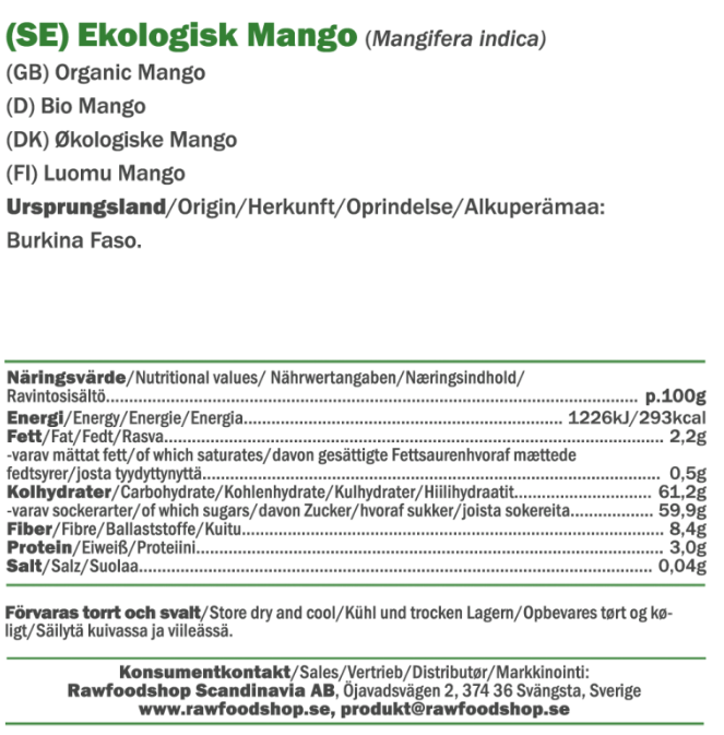 Tämä kuivattu mango on raakaravintoa, vegaaninen ja täysin luonnollinen herkku, joka hurmaa makealla ja raikkaalla maullaan. Mangomme tulee luomuviljelmiltä ja on kuivattu ilman lisättyä sokeria tai rikkidioksidia – tuloksena on puhdas ja maukas vaihtoehto makeannälkään. Mango on sekä Pakistanin että Intian kansallishedelmä, ja sitä käytetään laajasti perinteisessä ruoanlaitossa ympäri maailmaa. Nyt voit nauttia siitä aidossa, luonnollisessa muodossaan.