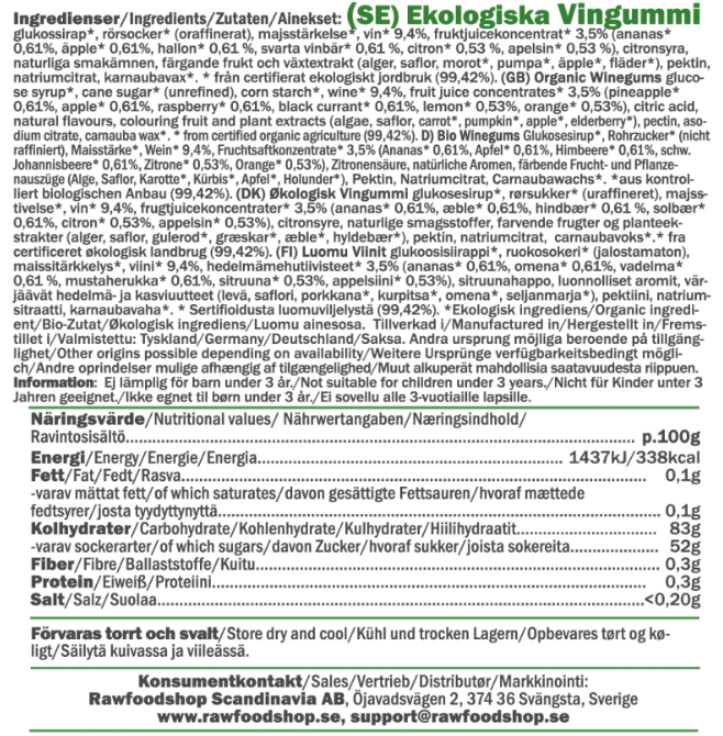 Etsitkö viinikumia, joka maistuu herkulliselta eikä sisällä liivatetta? Meidän luomu viinikumimme ovat maukas karkkivaihtoehto, jossa on napakka rakenne ja runsas maku – valmistettu täysin ilman eläinperäisiä ainesosia. Luonnolliset vadelman, omenan, sitruunan, appelsiinin, ananaksen ja mustaherukan aromit tekevät näistä vegaanisista viinikumeista värikkään makuelämyksen niin lapsille kuin aikuisillekin.