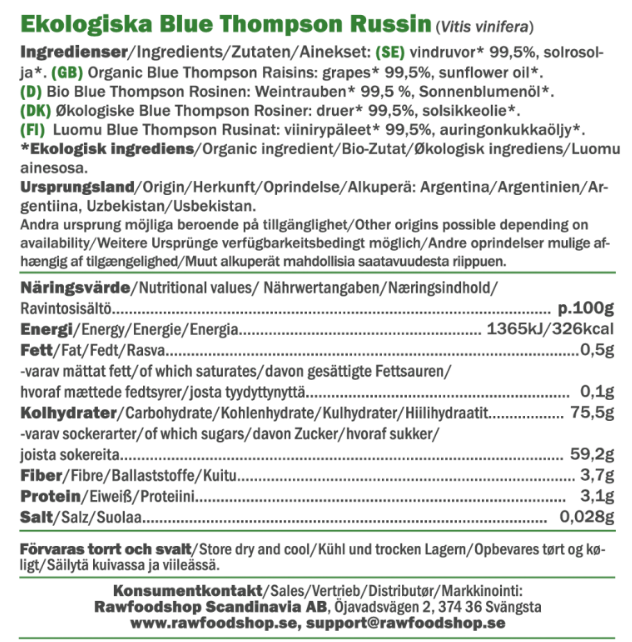 Haluatko maukkaan ja luomulaatuisen vaihtoehdon tavallisille sulttaanirusinoille tai keltaisille rusinoille? Blue Thompson -rusinat ovat täydellinen valinta. Ne sopivat niin välipaloihin kuin leivonnaisiinkin – sekoita ne mysliin, ripottele jogurtin päälle tai leivo herkullisia kaurakeksejä rusinoilla. Lisäksi ne ovat erinomainen vaihtoehto niille, jotka rakastavat kokeilla uutta keittiössä – mikset testaisi niitä seuraavassa aprikoosi-rusinaleivässäsi? Anna luovuuden virrata!