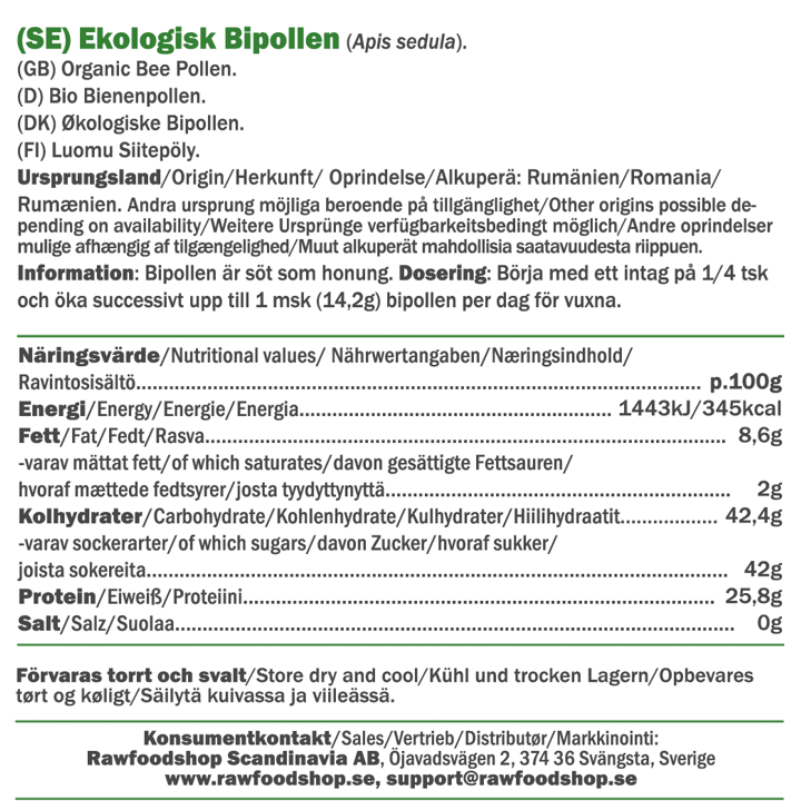 Siitepölymme on kuivattu raakana sen luonnollisten ominaisuuksien ja laadun säilyttämiseksi. Luomusertifioinnin ansiosta varmistetaan, että tuote valmistetaan ilman tarpeettomia lisäaineita ja luonnon prosesseja kunnioittaen. Halusitpa sitten hemmotella itseäsi herkullisella aamiaisella, luoda kauniita leivonnaisia tai kokeilla uusia makuja ruokavaliossasi, mehiläisten siitepöly on erinomainen valinta. Jos etsit korkealaatuista luomusiitepölyä, tämä tuote on varma valinta – luonnollinen, kaunis ja täynnä mahdollisuuksia!