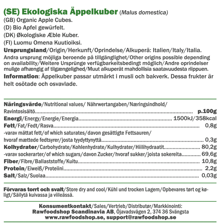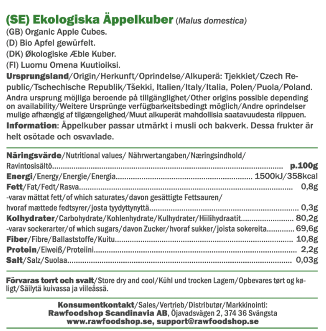 Luomukuivatut omenakuutiomme ovat pieniä, maukkaita paloja, jotka on varovasti kuivattu alle 40°C lämpötilassa luonnollisen maun ja rakenteen säilyttämiseksi. Nämä kuutiot ovat täydellisiä sinulle, joka haluat maukkaan ja helpon välipalan. Ne on valmistettu huolellisesti valituista luomuomenoista ja sopivat erinomaisesti sekä leivonnaisiin että aamiaiskulhoihin tai osaksi kotitekoista hedelmä- ja pähkinäsekoitusta.