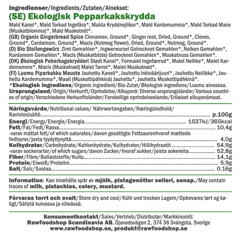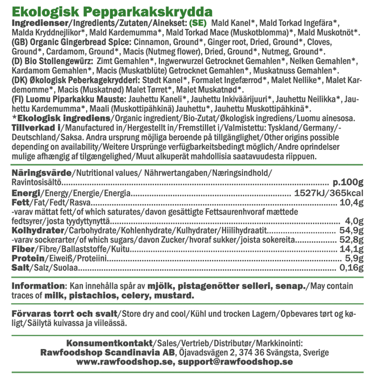 Tällä luomumausteseoksella tuot taatusti esiin perinteisen piparkakun maun leivonnaisissasi. Täydellinen yhdistelmä kanelia, neilikkaa, kardemummaa, muskotinkukkaa ja muskottipähkinää tekee tästä mausteesta monikäyttöisen suosikin niin pehmeisiin piparkakkuihin kuin perinteisiin pikkuleipiin. Se sopii täydellisesti niin perinteiseen joululeivontaan kuin modernimpiin, gluteenittomiin tai vegaanisiin resepteihin. Tämä luomumausteseos on suunniteltu niille, jotka haluavat leipoa herkullisesti luonnollisista raaka-aineista – helposti ja ilman kompromisseja. Kokeile myös smoothieissa, granolassa, rahkassa, jogurtissa tai lämpimissä juomissa, kuten chai latessa – missä tahansa haluat sen aidon piparkakkumaun nopeasti ja vaivattomasti.
