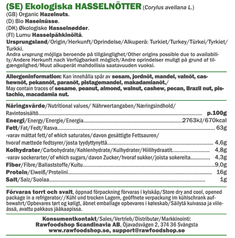 Ekologiset hasselpähkinämme ovat korkeinta premium-laatua ja täynnä makua. Ne ovat upeita sellaisenaan syötäviksi tai leivonnassa ja ruoanlaitossa käytettäviksi. Niissä on rikas ja täyteläinen maku, joka parantaa kaikkea yksinkertaisista välipaloista juhlavampiin leivonnaisiin. Riippumatta siitä, nautitko niistä sellaisenaan vai paahdatko hasselpähkinöitä intensiivisemmän ja henkilökohtaisemman maun saavuttamiseksi, tämä tuote tulee nopeasti suosikiksesi ruokakomerossasi.