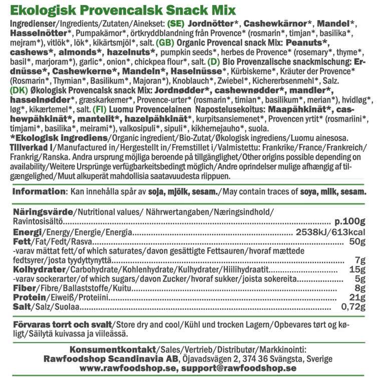 Provencelainen Snacksekoitus LUOMU on luomulaatuinen, vegaaninen pähkinä- ja siemensekoitus, joka on maustettu rakastetuilla "herbes de Provence" -yrteillä – aromaattinen ja tasapainoinen yrttisekoitus, joka vie ajatukset Etelä-Ranskan auringon alle. Tämä herkullinen sekoitus sisältää runsaasti maapähkinöitä, cashewpähkinöitä, manteleita, hasselpähkinöitä ja kurpitsansiemeniä – jokainen suupala on täynnä makua ja suutuntumaa. Snacksekoitus sopii täydellisesti aperitiivin kylkeen tai vaikka rapeaksi lisukkeeksi raikkaan salaatin päälle.