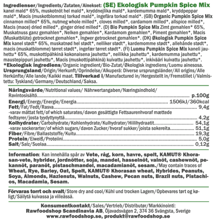 Pumpkin Spice Mix on monikäyttöinen ja sopii kaikkeen klassisista kurpitsapiirakoista latteihin. Sen täyteläiset ja tasapainoiset maut tekevät siitä täydellisen valinnan sekä syksyn leivonnaisiin että lämpimiin juomiin. Luonnollisella koostumuksellaan ilman lisäaineita se on aito valinta niille, jotka arvostavat korkeaa laatua ja luomuraaka-aineita.