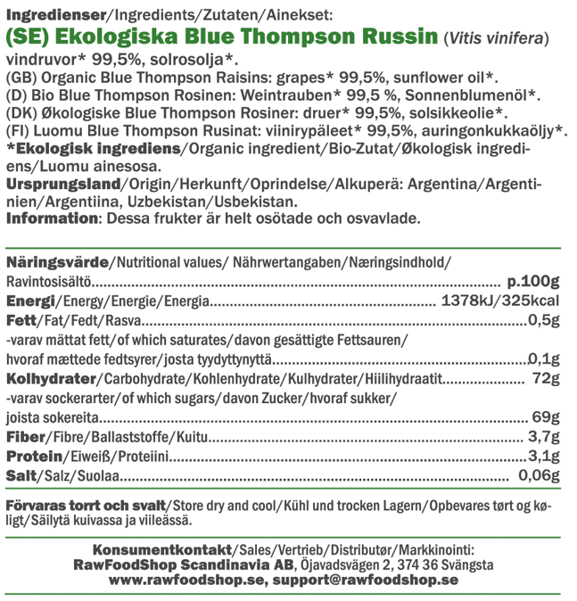 Haluatko maukkaan ja luomulaatuisen vaihtoehdon tavallisille sulttaanirusinoille tai keltaisille rusinoille? Blue Thompson -rusinat ovat täydellinen valinta. Ne sopivat niin välipaloihin kuin leivonnaisiinkin – sekoita ne mysliin, ripottele jogurtin päälle tai leivo herkullisia kaurakeksejä rusinoilla. Lisäksi ne ovat erinomainen vaihtoehto niille, jotka rakastavat kokeilla uutta keittiössä – mikset testaisi niitä seuraavassa aprikoosi-rusinaleivässäsi? Anna luovuuden virrata!