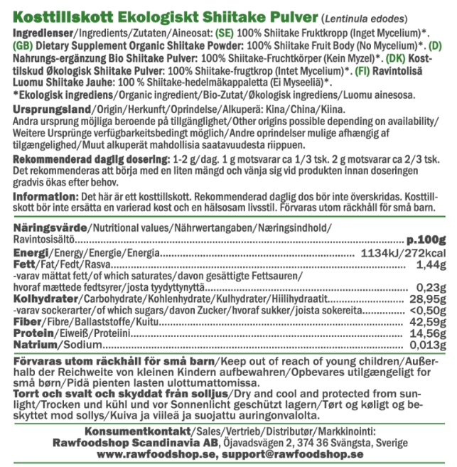 Shiitake-jauhe LUOMU on luomulaatuinen, vegaaninen ravintolisä, joka on valmistettu 100 % shiitake-itiöemistä, täysin ilman rihmastoa. Shiitake, jota kutsutaan myös "sienten keisariksi", on arvostettu erityisesti täyteläisen makunsa ansiosta. Hellävarainen kuivatus- ja jauhoprosessi säilyttää sienen luonnolliset ominaisuudet, mikä tekee siitä erinomaisen lisän tasapainoiseen ruokavalioon.