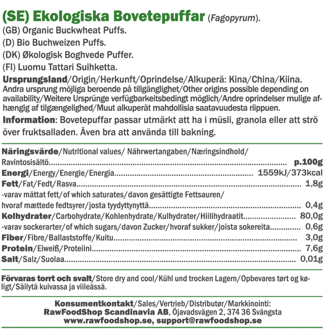 Tattaripuffimme ovat luonnollinen ja vegaaninen vaihtoehto, joka solahtaa saumattomasti osaksi aamiaista tai välipalaa. Ne valmistetaan 100 % täysjyvätattarista – ei mitään ylimääräistä. Kevyt ja rapea koostumus tekee niistä täydellisen lisän kotitekoiseen mysliin tai granolaan, mutta ne maistuvat yhtä hyvältä myös smoothieiden ja hedelmäsalaattien päällä. Eikä siinä vielä kaikki – tattaripuffit ovat loistava valinta myös gluteenittomaan leivontaan tai kotitekoisten välipalojen valmistukseen. Kokeile esimerkiksi tehdä omia proteiinipatukoita, raakakarkkeja tai siemennäkkäreitä. Mahdollisuudet ovat rajattomat – vain mielikuvitus on rajana!