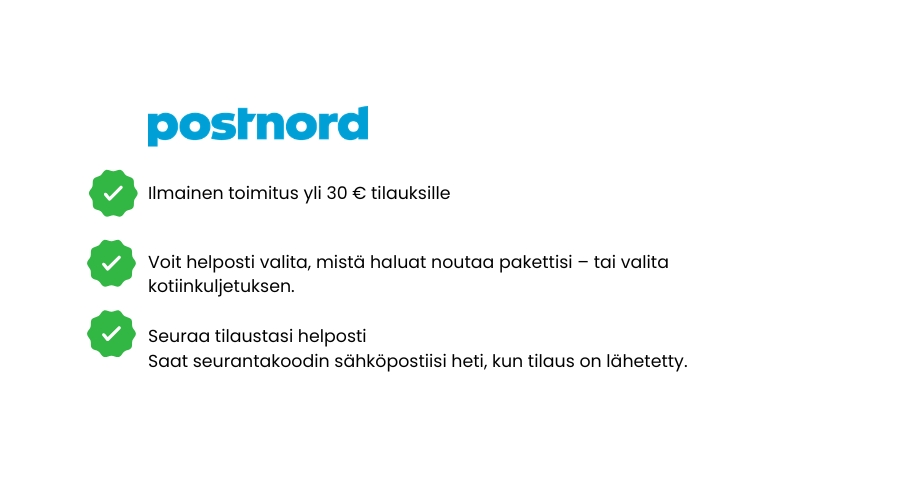 PostNord, valinnainen noutopiste: 5,90 EUR – Toimitus ilmaiseksi yli 30 EUR tilauksille