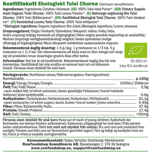 Tulsi Churna LUOMU on luomusertifioitu, vegaaninen ravintolisä, joka on valmistettu 100% Tulsi-kasvin (Ocimum tenuiflorum) lehdistä. Kasvi tunnetaan myös nimellä pyhä basilika, ja sillä on pitkä käyttöhistoria ayurvedassa. Tuote ei sisällä mitään lisäaineita – vain huolellisesti viljeltyjä ja kuivattuja lehtiä ilman kemiallisia torjunta-aineita.