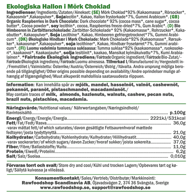 Luomupakastekuivatut vadelmamme tummassa suklaassa ovat ihana yhdistelmä hapokkaita marjoja ja rikasta, täyteläistä suklaata. Pakastekuivatut vadelmat säilyttävät intensiivisen makunsa ja rapean koostumuksensa, kun taas tumma suklaa lisää herkullisen ja pehmeän kontrastin. Tämä herkullinen sekoitus on täysin vegaaninen ja EU-luomusertifioitu. Siksi se on täydellinen valinta sinulle, joka haluat nauttia jotain todella hyvää samalla kun välität ympäristöstä.