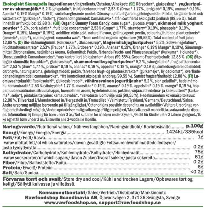 Olipa kyseessä perjantai-illan herkutteluhetki, piknik tai lasten juhlat, tämä luomuvaahtomakeinen on erinomainen valinta. Kätevä 100 gramman pakkaus on helppo ottaa mukaan ja jakaa perheen ja ystävien kanssa – tai nauttia yksin pienenä arjen luksuksena. Jogurttikumit sulavat suussa, ja niissä on hienovarainen hedelmäinen maku, mikä tekee jokaisesta puraisusta pienen muistutuksen siitä, kuinka herkullista ja luonnollista makeinen voi olla. Valitse meidän luomuvaahtomakeisemme, kun haluat maistuvan ja huolellisesti valmistetun herkun, joka tekee jokaisesta hetkestä hieman hauskemman ja herkullisemman!